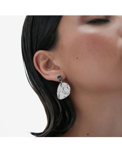 Los pendientes de plata están diseñados con un gran óvalo asimétrico con una trama doblada, lo que les confiere un aspecto único y moderno. Son muy ligeros y cómodos de llevar, lo que los hace ideales para uso diario o eventos más formales. En la parte inferior de cada pendiente cuelga una lágrima de cristal gris, que añade un toque de elegancia y brillo sutil.
