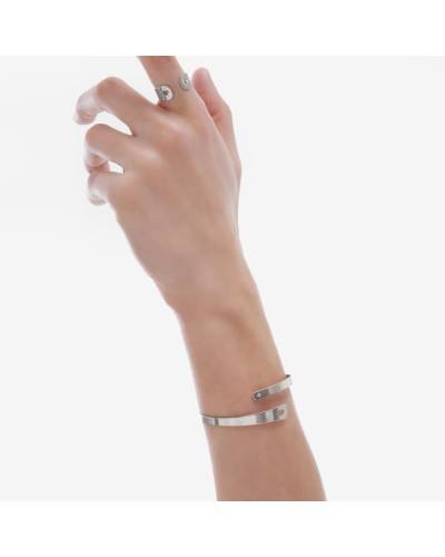 Brazalete de Victoria Cruz de Plata de Ley bañado en Rodio en forma de corazón con un pequeño cristal color blanco. Un complemento refinado que aporta luz y personalidad a tu día a día.