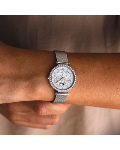 Reloj para mujer en color plateado y blanco. El principal atractivo de este reloj reside en su esfera ya que posee un árbol de la vida. Su caja es de acero inoxidable de 29mm de diámetro, con mecanismo de cuarzo analógico protegido por cristal mineral. Su correa es de acero inoxidable tipo malla milanesa.