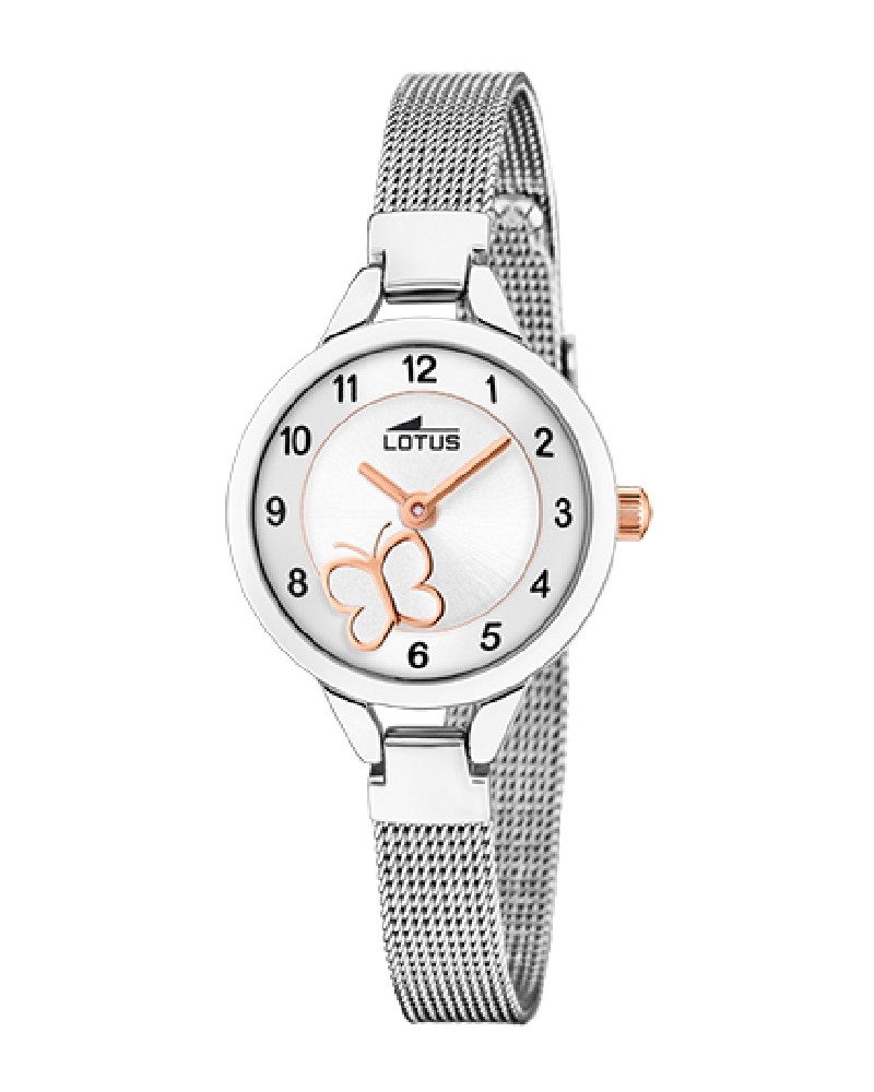 Reloj Lotus 18862/1 analógico para niña fabricado en acero inoxidable plateado. Se trata de un reloj compuesto por caja plateada con un detalle en rosado en forma de mariposa y con índices en color negro. Su correa es de malla milanea con cierre ajustable.
