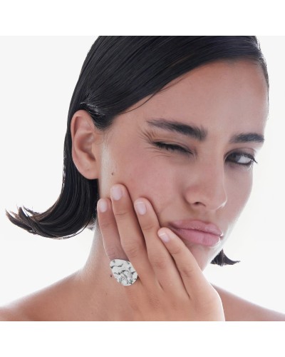 El anillo Victoria Cruz Fullness para mujer está elaborado en plata bañada en rodio, lo que le aporta brillo y mayor resistencia. Su diseño destaca por una pieza superior con acabado texturizado que añade carácter y estilo. Elegante y moderno, es ideal para complementar cualquier look con un toque sofisticado.